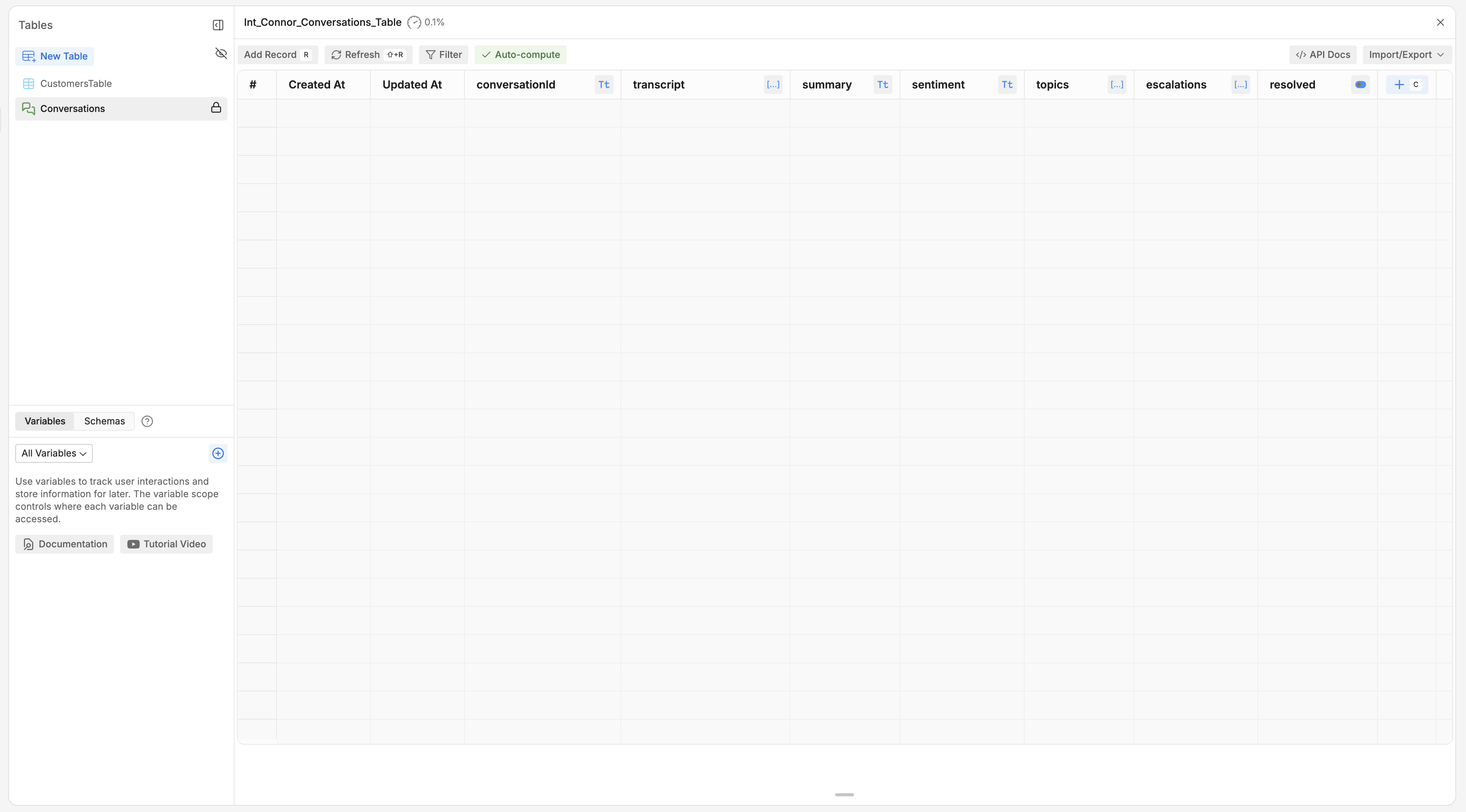 This table is automatically populated every time a conversation ends. Each conversation takes up its own record, and stores information like sentiment analysis, topics covered, and an AI-generated summary of the conversation.
