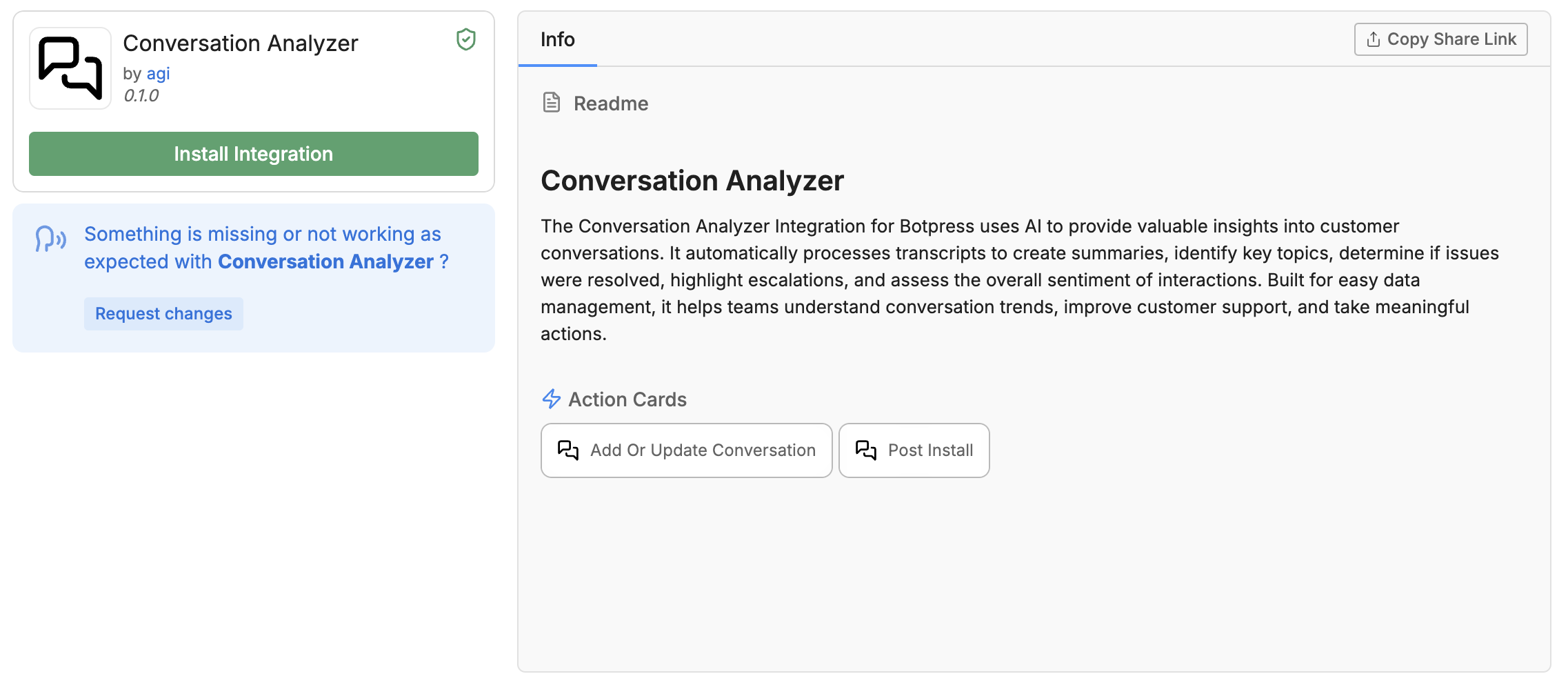 Start by installing the Conversation Analyzer integration from the integration hub.
